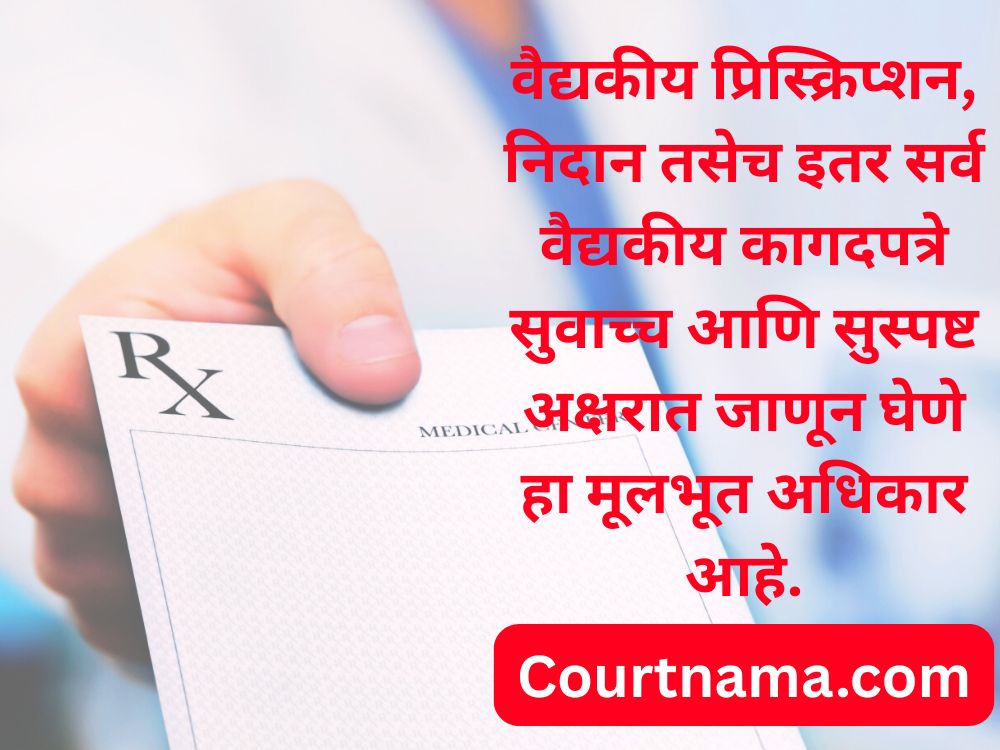 ‘सुवाच्च अक्षरातील वैद्यकीय प्रिस्क्रिप्शन आणि निदान’ हे आरोग्याच्या अधिकाराचा अविभाज्य भाग आहे. त्यामुळेच औषधांची चिठ्ठी सुस्पष्ट आणि सुवाच्च अक्षरात असणे हा भारतीय राज्यघटनेच्या अनुच्छेद २१ अंतर्गत मूलभूत अधिकार आहे, असे पंजाब आणि हरियाणा उच्च न्यायालयाचे न्यायमूर्ती जसगुरप्रीत सिंग पुरी यांनी म्हटले आहे. या निर्णयानुसार यापुढे जर डाॅक्टरांनी सुवाच्च अक्षरात वैद्यकीय प्रिस्क्रिप्शन लिहिले नसेल तर रुग्ण वा रुग्णाचे कुटुंबीय मूलभूत अधिकाराचे उल्लंघन झाल्याचा दावा करुन न्यायालयात दाद मागू शकणार आहेत.